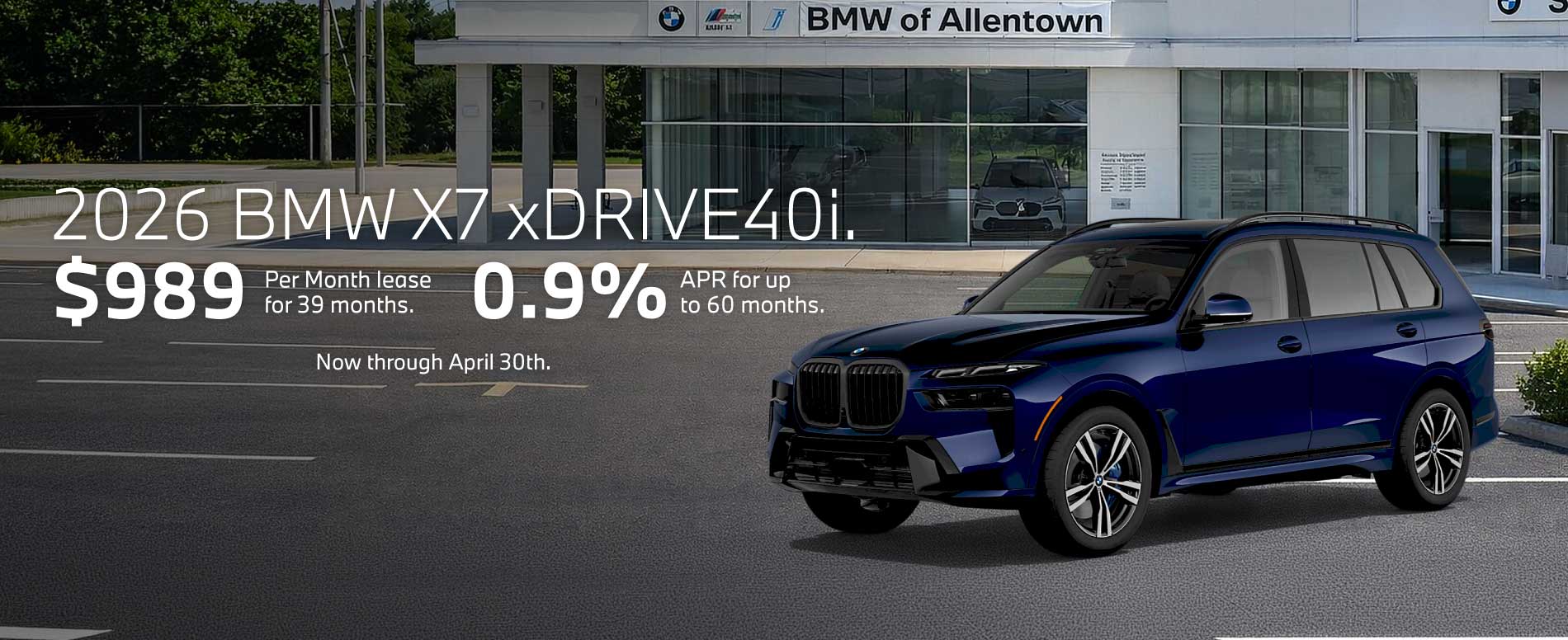 Through April 30, 2026, 0.90% APR financing for up to 60 months on new 2026 BMW X7 xDrive40i model is available from participating BMW dealers to well qualified customers who meet BMW Financial Services NA, LLC credit requirements. For example, with $0.00 down payment and 0.90% APR, a retail installment contract on a 2026 BMW X7 xDrive40i with MSRP of $93,200.00 may be repaid in 24 monthly installments of $3,919.84 or may be repaid in 60 monthly installments of $1,589.13. MSRP excludes tax, title, and license. Not all customers will qualify for down payment waiver or lowest rate. Other rates and payment terms available. Applicable Credits and National Competitive Credit of $2,000 (consists of $1,000 BMW of North America, LLC credit plus $1,000 contribution from your BMW Center) are credits against the MSRP of the vehicle purchased and available to customers who finance through BMW Financial Services NA, LLC. All credits valid through April 30, 2026. All offers are subject to dealer participation. Offers valid through April 30, 2026. Visit your authorized BMW Center for important details.